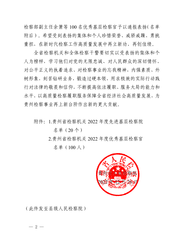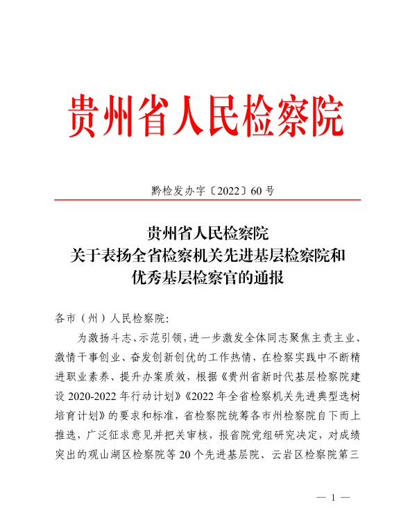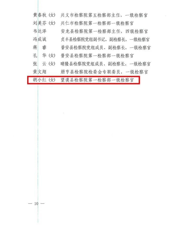近日,贵州省人民检察院印发《关于表扬全省检察机关先进基层检察院和优秀基层检察官的通报》,望谟县人民检察院一级检察官胡小红同志荣获“贵州省检察机关2022年度优秀基层检察官”表彰。