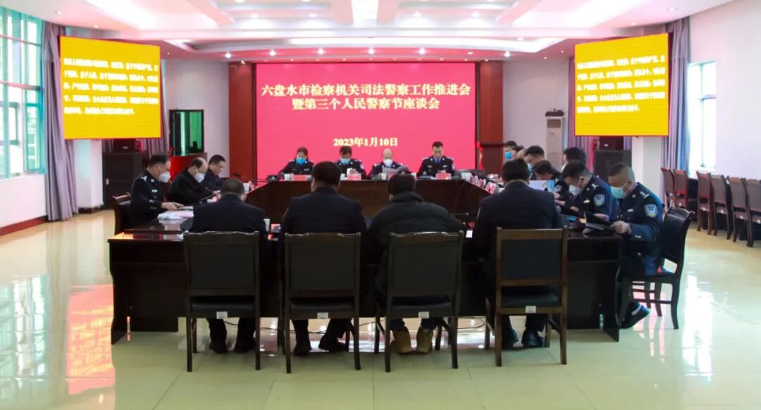 宣誓结束后,由六盘水市人民检察院主办、盘州市人民检察院承办的六盘水市检察机关司法警察工作推进会暨第三个人民警察节座谈会召开。六盘水市人民检察院党组副书记、常务副检察长杨胜鸿出席会议并讲话,盘州市人民检察院党组书记、检察长彭鹏致欢迎词,六盘水市人民检察院警务部副支队长杜天文主持会议,六盘水市检察机关全体司法警察参加了座谈会。
